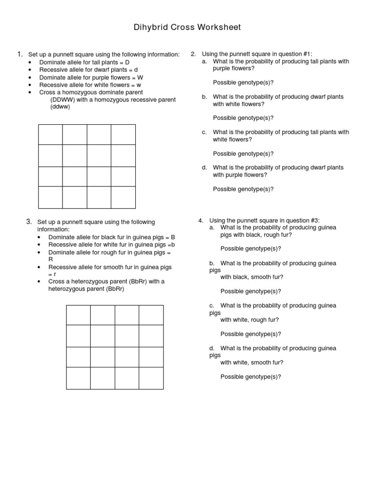In the following dihybrid cross there is no need to fill out the whole sixteen square table to when a purebred recessive plant is crossed with a plant with the dominant phenotype you can find out if the. A dihybrid cross is a cross that looks at how two different genes are passed on from a pair of organisms. The worksheets are offered in developmentally. Gregor johann mendel was the first person who discovered the basic principles of heredity during the. It shows what possible combinations of. Could anyone show me how to start this problem out? This law states that alleles are transmitted to offspring independently of one another. A dihybrid cross refers to when two genes dictate a certain trait. A typical monohybrid cross follows one gene and can be easily observed in a 2 x 2 punnett square. Types of chemical bonds worksheets answer key. Monohybrid and dihybrid cross practicedraft. Dihybrid cross is a cross between two different lines/genes that differ in two observed traits. If the inheritance of seed color was truly independent of seed shape, then when the f1 dihybrids were crossed to each other, a 3:1 ratio of one trait should be.